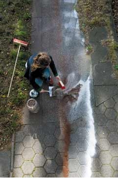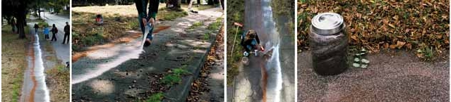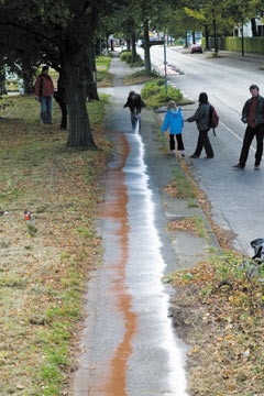 Die Künstlerin Claudia Behling streut in ihrer Performance Einschnitte eine Zucker- und Kaffeespur entlang der Schimmelmannstraße. Der Zucker glänzt, der feine braune Kaffee verströmt einen intensiven Duft. |