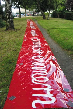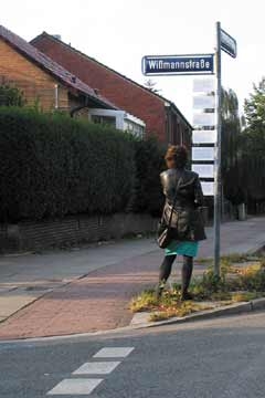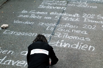 Es ist der 15. September 2007. Ein kalter, windiger Tag. ... Zug um Zug trägt die Künstlerin, in eine warme Daunenweste gehüllt, mit dickem Pinsel und weißer Acryllackfarbe die Worte 'remember' und 'erinnern' auf die gespannte Lackbahn. Eine Niederschrift auf alarmierend glänzender Folie über wachsendem Grün. ... Frisch gemähtes Gras weht auf die noch nassen Schriftzüge. Die Anwohner der Einfamilienhäuser lassen sich fast nicht blicken, einige Kinder kommen. Ein Mädchen meint, ihre Mama habe gesagt, das sehe aus wie eine 'Blutstraße'. Gardinen schieben sich auseinander. Nun kommen vereinzelt Nachbarn, wohl auf dem Weg zum Einkauf. Sie treten direkt auf die Schreibende zu, sprechen sie freundlich an. Sie 'wissen schon': 'der Schimmelmann', die Straßenbenennung, die Geschichte des Viertels, die Sache mit dem Sklavenhandel. Keine gute Geschichte. |