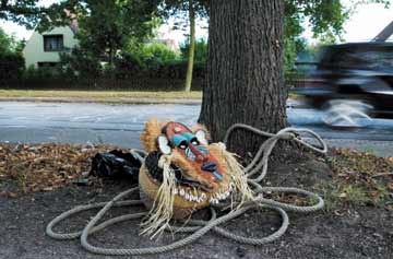 Auf der Schimmelmannstraße umwickeln die Künstlerbrüder Mark und Matvey Slavin aus St. Petersburg eine Baumreihe mit Folie und schnüren Schiffstaue wie Fesseln um die Stämme. Darüber befestigt der ghanaische Künstler Joe Sam-Essandoh afrikanische Masken, zum Leben erweckte Assemblagen aus verworfenen Materialien. |
