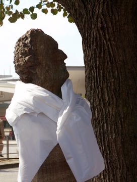Ansicht von der 'rituellen Begehung'. Das Bild zeigt die 2006 am Wandsbek-Markt errichtete Büste des Wandsbeker Großkaufmanns, dänischen Schatzmeisters und transatlantischen Sklavenhändlers Heinrich Carl von Schimmelmann, symbolisch und ironisch gewickelt in eine 'weiße Weste' aus Baumwolltuch - in den Maßen des Stauraums für Sklaven auf Schimmelmanns Schiffen im Dreieckshandel. Photo: Stilla Seis
