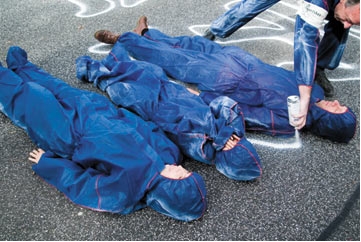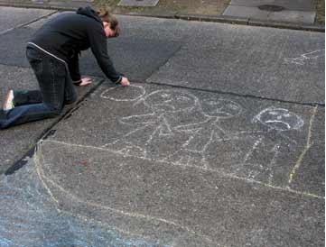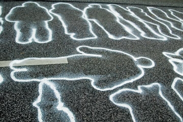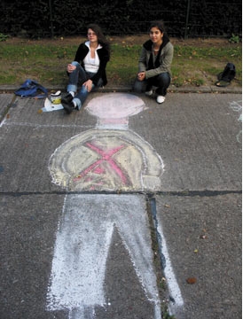 Detailansicht der Arbeit 'Mittwegs auf unseres Lebens Reise' auf der Schimmelmannstraße in Wandsbek. Die auf dem Asphalt gesprayten Kreidefiguren sind die Umrisse von 161 beteiligten AnwohnerInnen, PassantInnen und SchülerInnen. Sie erinnern an frühe Radierungen, die zynisch die 'optimale Auslastung' eines Sklavenschiffes abbildeten: die Gefangenen wurden im Cargoraum Körper an Körper zusammegepfercht nach Übersee transportiert. Viele starben unterwegs und wurden ins Meer geworfen. Photo: Stilla Seis